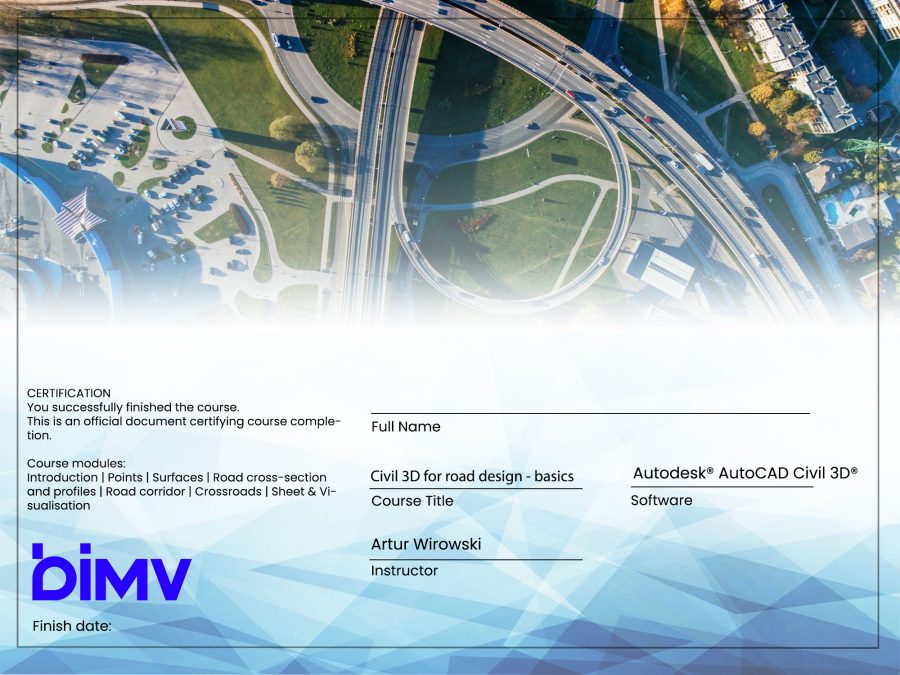 Kurs online Civil 3D – moduł drogowy bazowy pokazuje w jaki sposób zacząć pracę z programem Civil 3D. Począwszy od pierwszych punktów i powierzchni, poprzez linie trasowania, profile i przekroje normalne, tworzymy prosty model korytarza i skrzyżowanie. Ostatecznie wizualizujemy naszą pracę na widokach przekrojów i arkuszach. Kurs w przejrzysty i dopasowany do potrzeb inżyniera budownictwa projektującego drogi pokaże Ci jak pracować w programie Civil 3D. Powstał on na bazie wieloletniego doświadczeniu autora i licznym rozmowom z projektantami dróg.