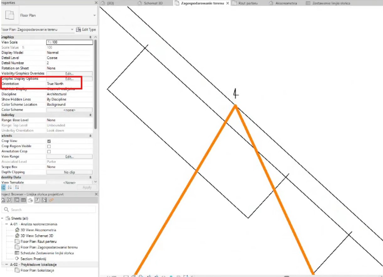 Prawidłowa orientacja projektu względem stron świata jest absolutnie kluczowa dla wiarygodności analizy. Wszystkie obliczenia astronomiczne dotyczące pozycji słońca opierają się na rzeczywistych kierunkach geograficznych. Błędne ustawienie północy sprawi, że cała analiza będzie bezwartościowa.