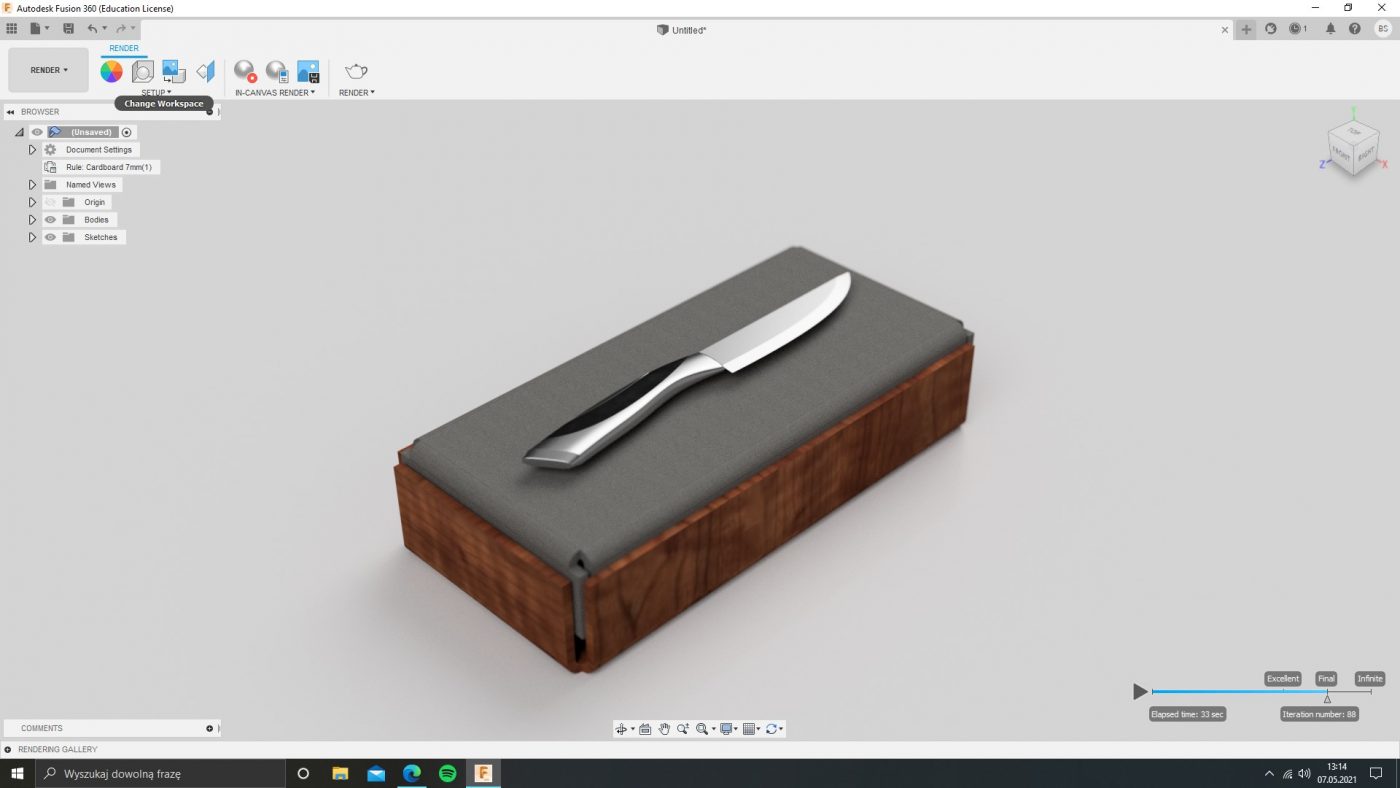 Fusion 360 oferuje prosty silnik renderujący, który w szybki sposób pozwala zwizualizować nasz projekt. Możemy nim dodać własne oświetlenie HDRI, edytować dostępne materiały i korzystać naszej wizualizacji w czasie rzeczywistym.