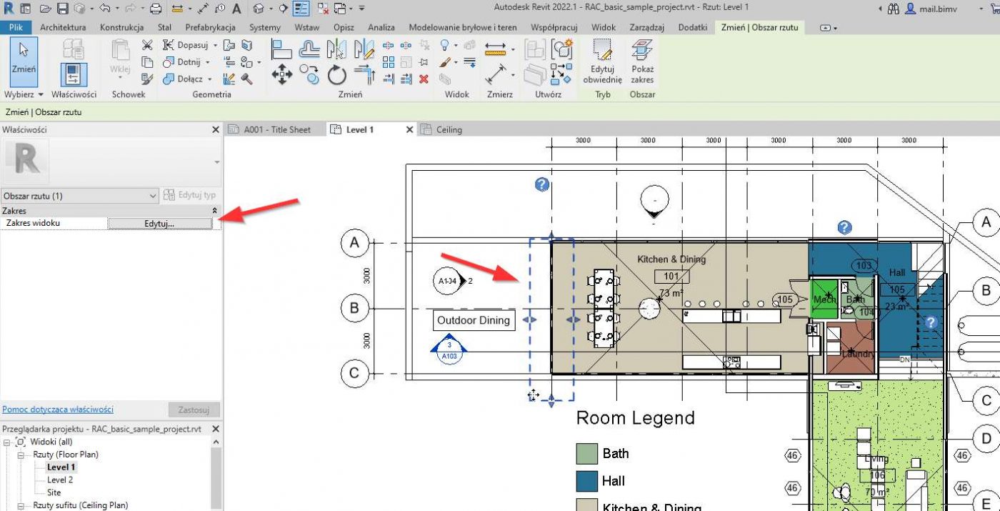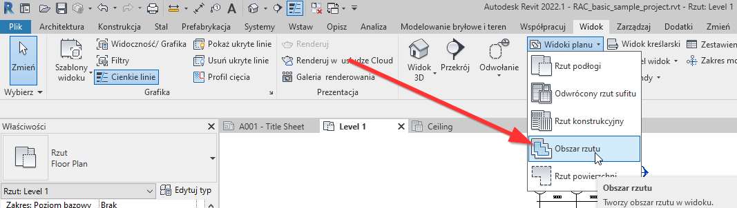 1. Wybierz Obszar rzutu z zakładki Widok -> Widoki Planu -> Obszar rzutu.