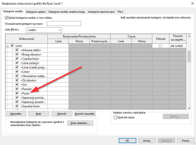 Wskazówka: Style linii w ostrych nawiasach <> to style wbudowane w program Revit i często odpowiadają za wyświetlanie innych ustawień jak ma to miejsce w tym przypadku Głębokości Widoku